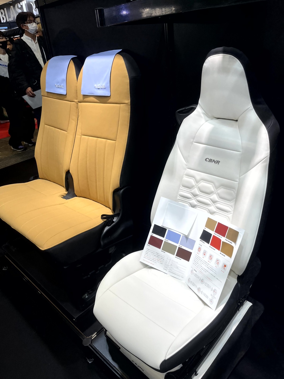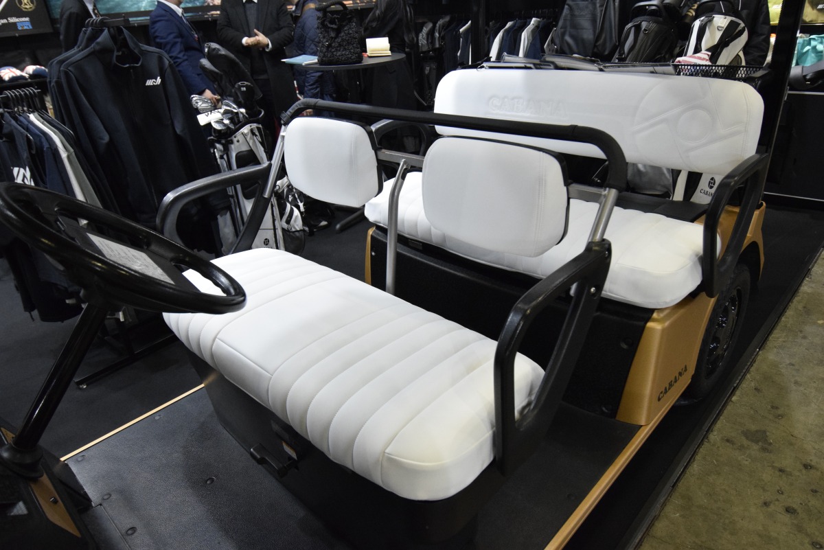 まず驚くのはその質感だ。しっとりしながらサラっと感もある新素材は、素材にシリコーンを含ませたもの。単に質感を高めただけでなく、高い耐熱性、耐候性、撥水性、防汚性を実現。実は、彼らのゴルフ用カスタムカートには、シートヒーターのラインナップがあり、発熱に対する耐久性を高めるための採用でもあるという。また、素材には抗菌剤も含有、耐薬品性にも優れ、環境負荷も少ないなど、まさにゴルフカートのシートカバーとしてこれ以上ない進化を遂げている。