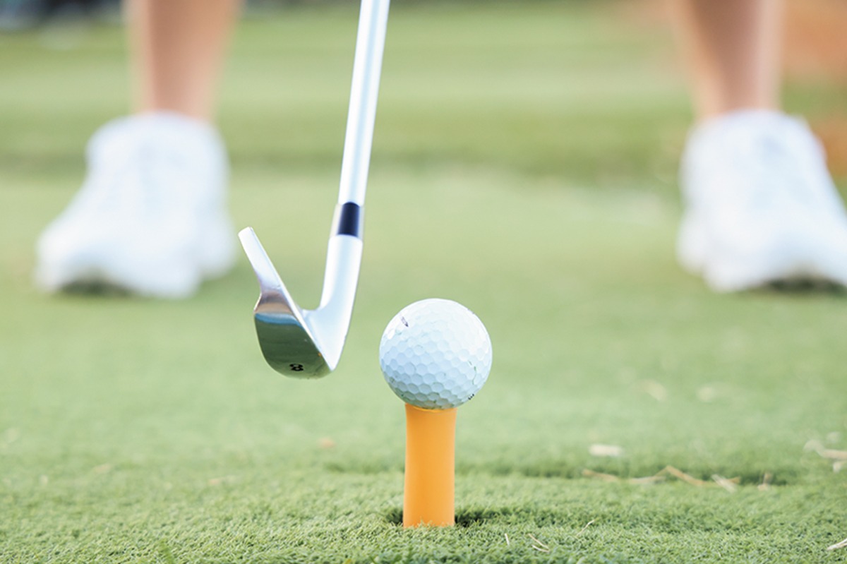 マットの上だと少しぐらいダフってもソールが滑ってそれなりに打ててしまうが、芝の上だとそうはいかない。ティアップしたボールを打つことで、ヘッドの入射角を整えてミート率を高めよう。