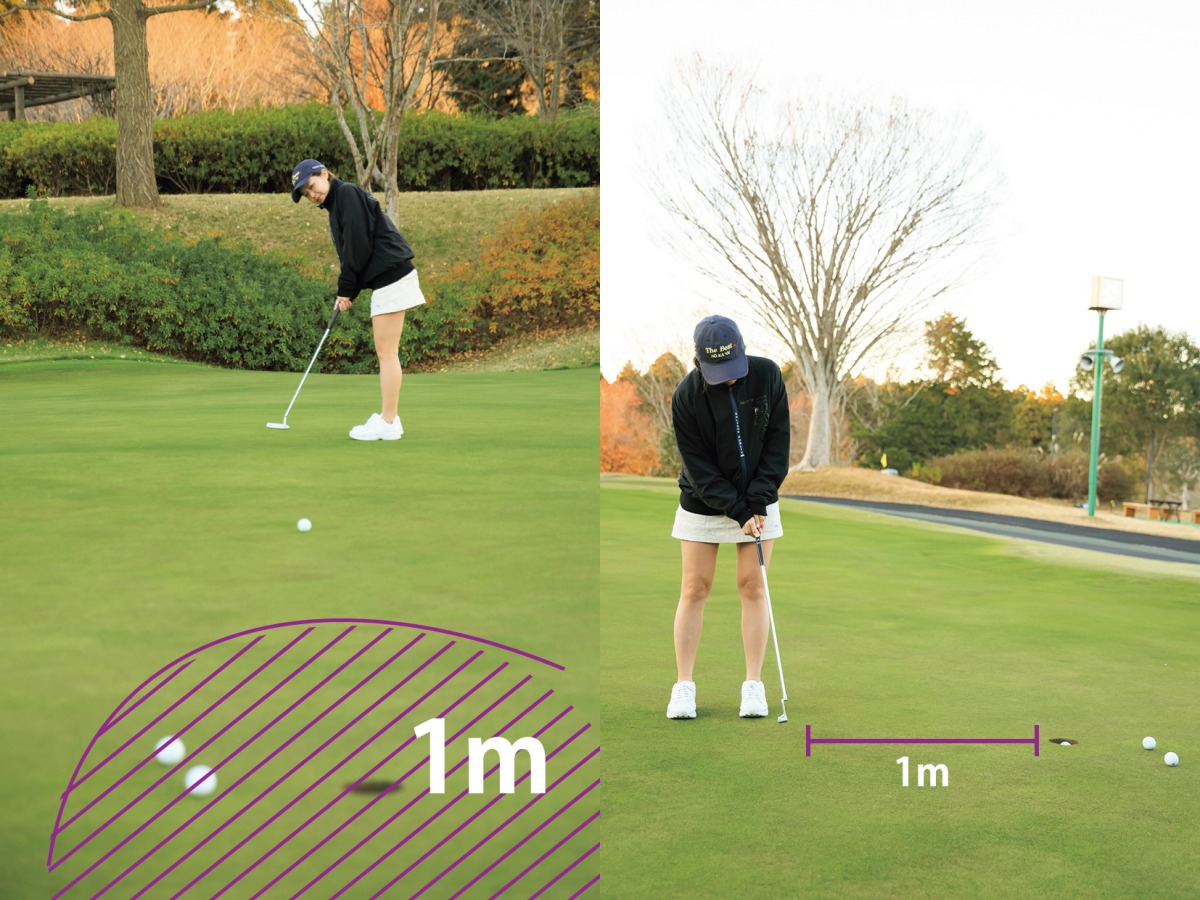 ミドルパット以上を一発で決めるのは難しいので、カップから1m以内に寄せればOK。あとは上り、下り、フック、スライスと様々なラインの1mのパットを打つ。スコアメイクにはショートパットの精度が不可欠。