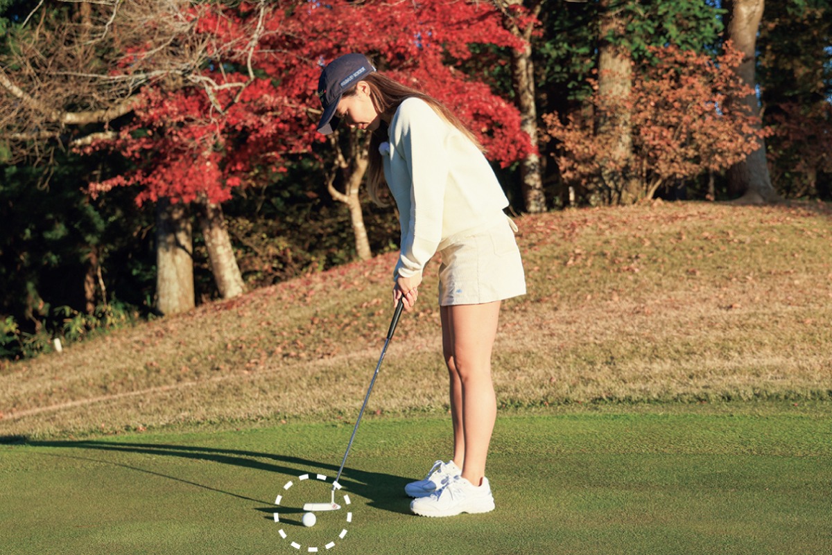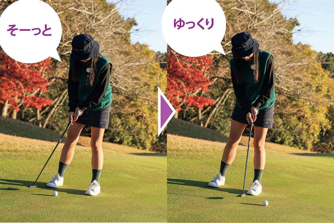 下りのパッティングはボールの転がりに勢いをつけないことが重要。腹筋に力を入れて構えたら、そーっと引いてそーっと打つ「ゆっくりストローク」で打ってみよう。フォローまでゆっくりがポイントだ。