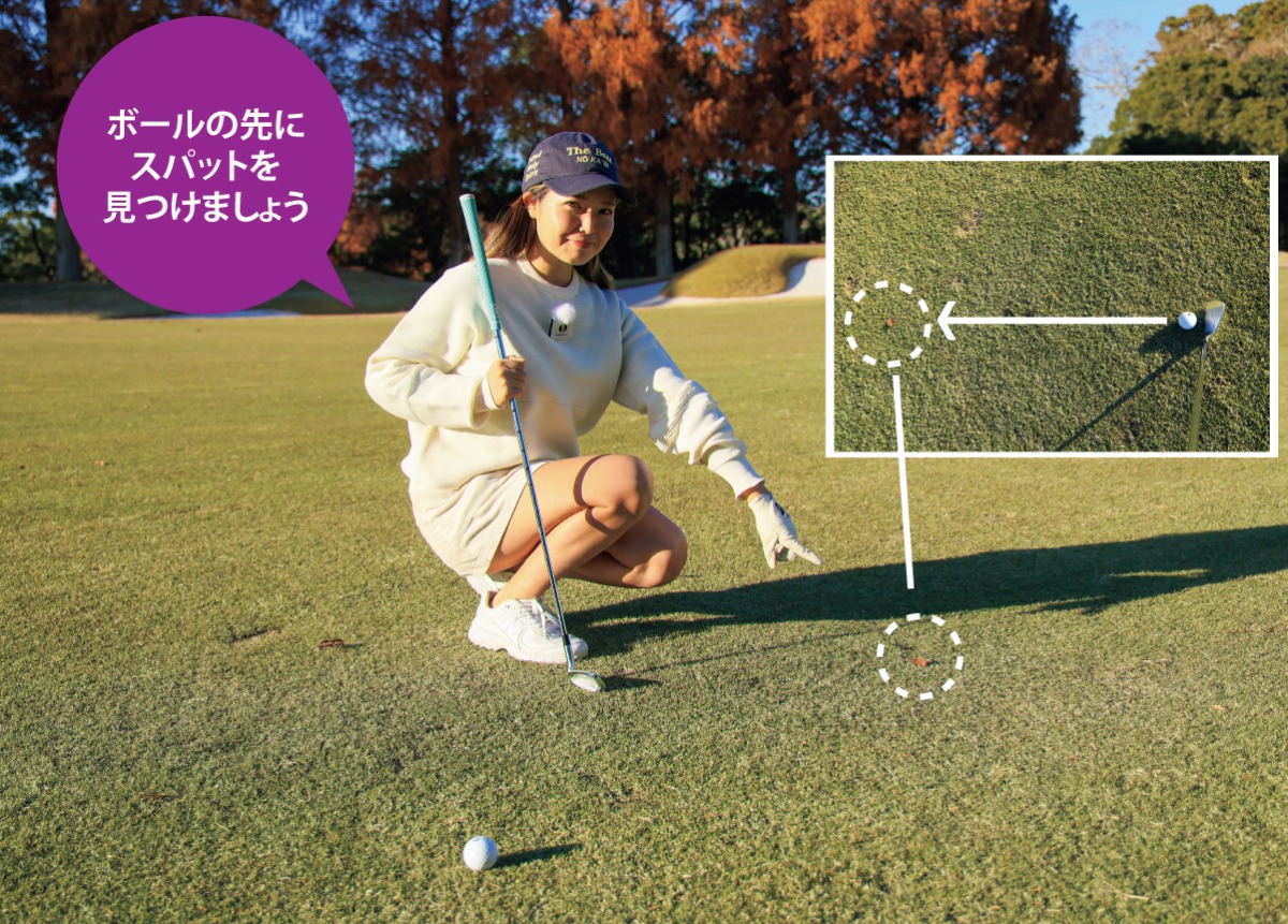 ボールと打ち出し方向を結んだラインの線上に、落ち葉や芝の色が変わった場所などを見つけて目印(スパット)にしよう。一度スパットを決めたら、あとはターゲットを見ないで打つのがまいち流だ。