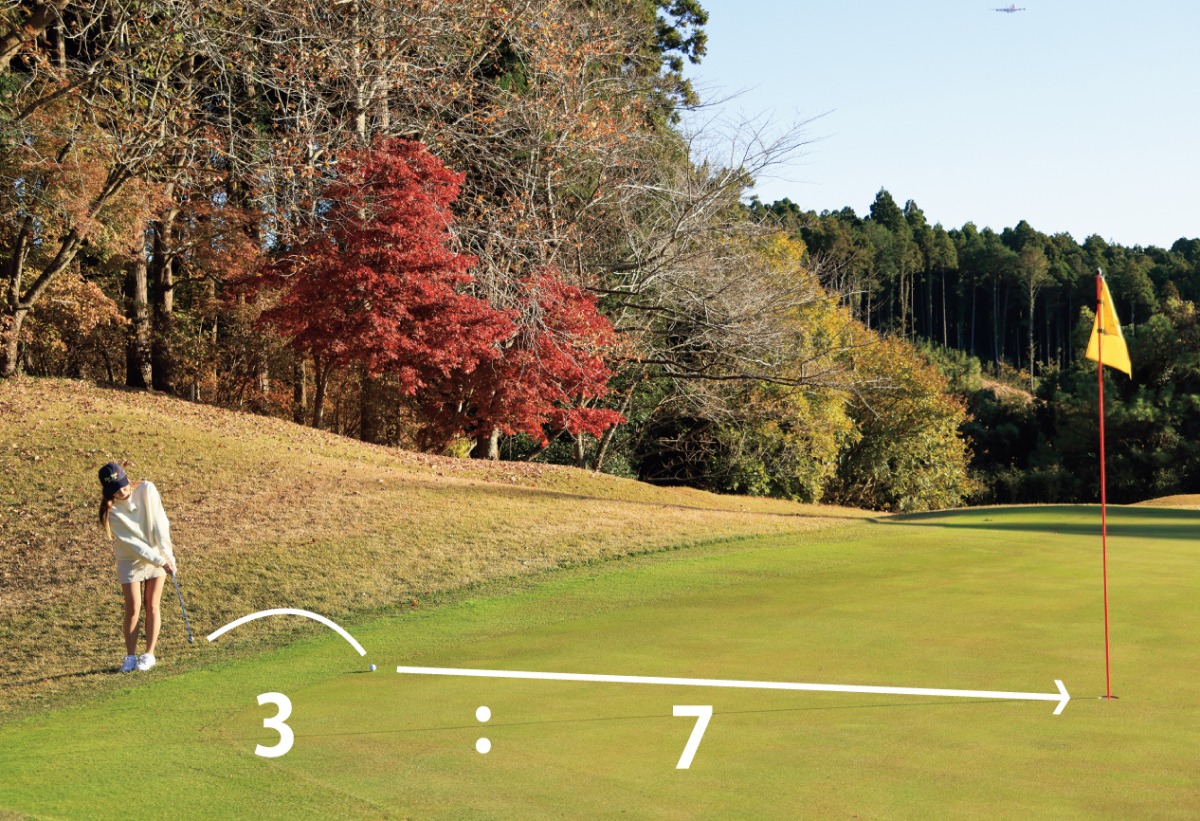スタンスを狭くして9番アイアンを短く持って構えたら、キャリー3:ラン7のイメージで転がそう。左足体重をキープし、手先を使わないことがポイントだ。