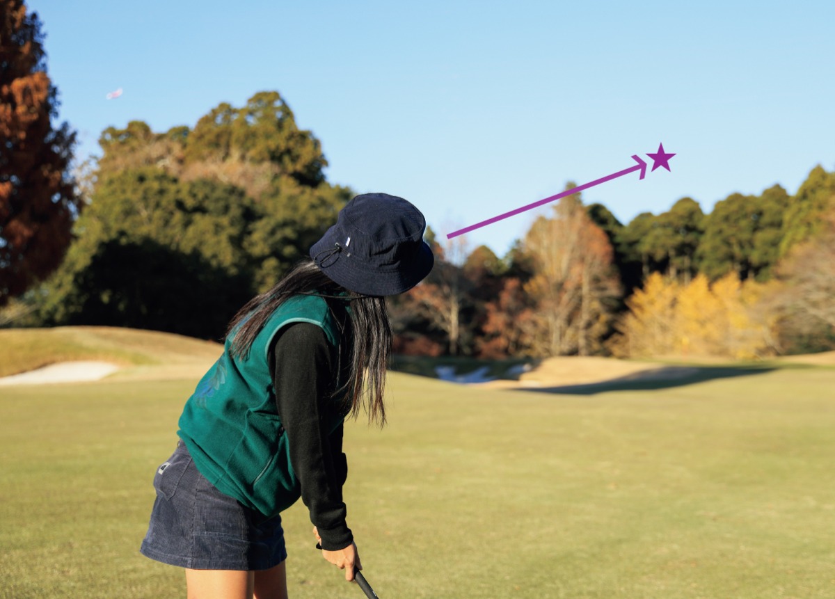 まいち:2打目以降はとくにアライメントが狂いやすいので、そこも注意してほしいです。練習場と違ってマットやラインがないので、狙ったところに向くのって意外と難しいんですよね。最初は同伴者にチェックしてもらって、狙った所に向けているかを確認しましょう。