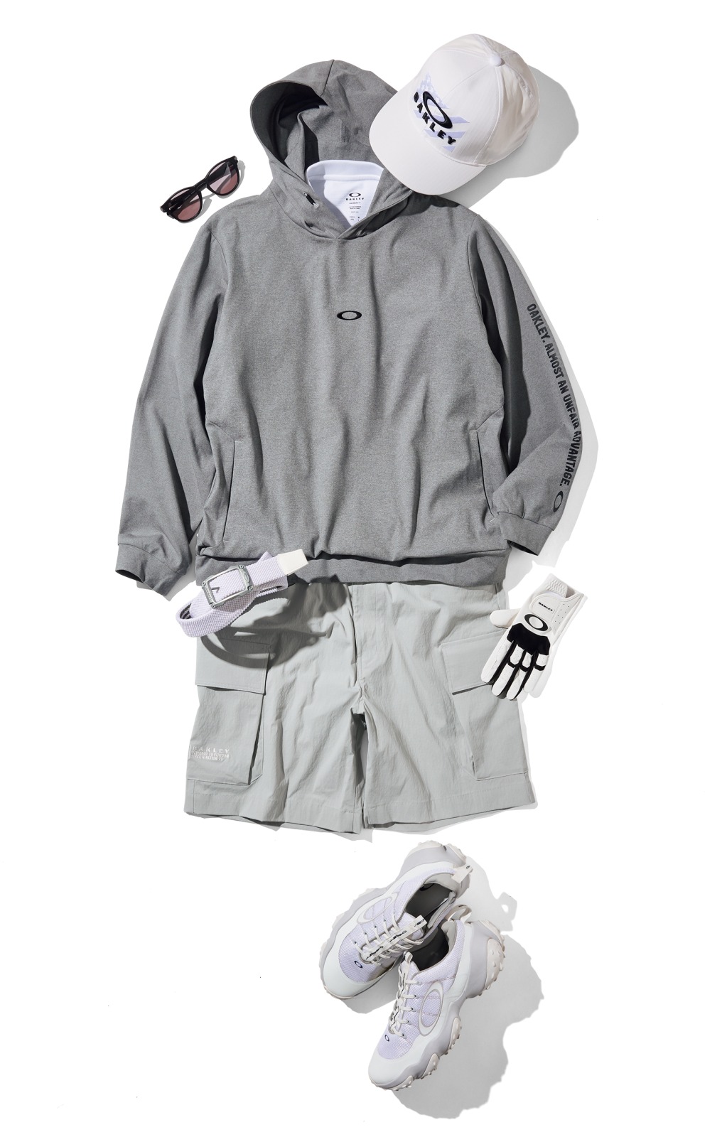 ゴルフ以外のシーンでも取り入れやすいフーディーにカーゴショーツをセレクト。カジュアルなアイテムだが、グレーのワントーンにすることで、ほどよい大人っぽさを演出した。
