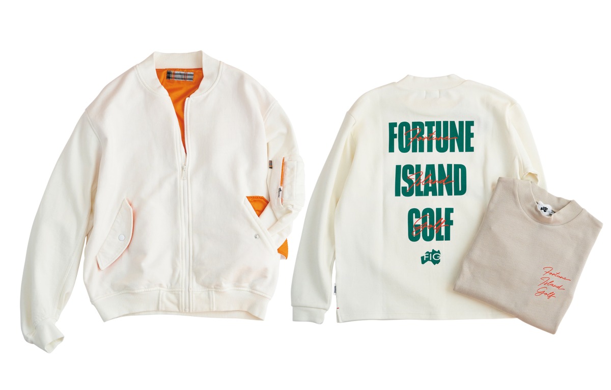 FORTUNE ISLAND GOLFによる別注カラーとなる「JACKSON MATISSE」のスウェットMA-1は、オーナー氏の要望で実現。42,900円。背面ロゴ入りのFORTUNE ISLAND GOLFのモックネックは各14,300円。