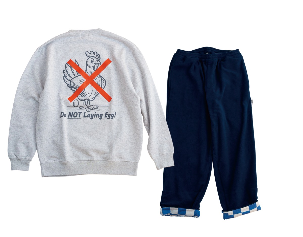 「たまごを生むな!」のイラストが秀逸なFORTUNE ISLAND GOLFの杢グレースウェット 12,980円。JACKSON MATISSE GOLFのパンツは別注色。25,300円。