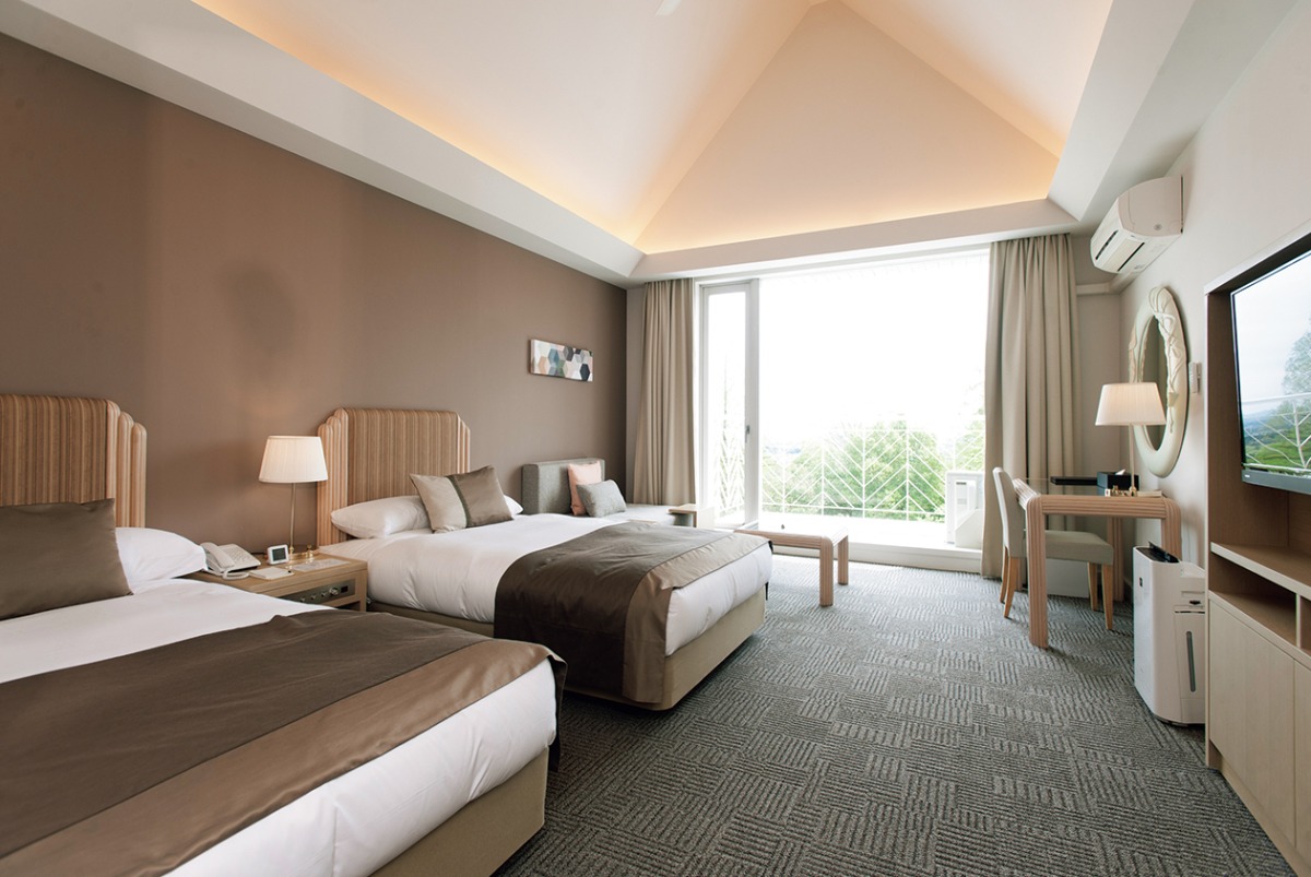 敷地内にロッジタイプの別府ゴルフホテルを併設。シングルルームとツインルームを完備しており、ニーズに応じてチョイスできる。