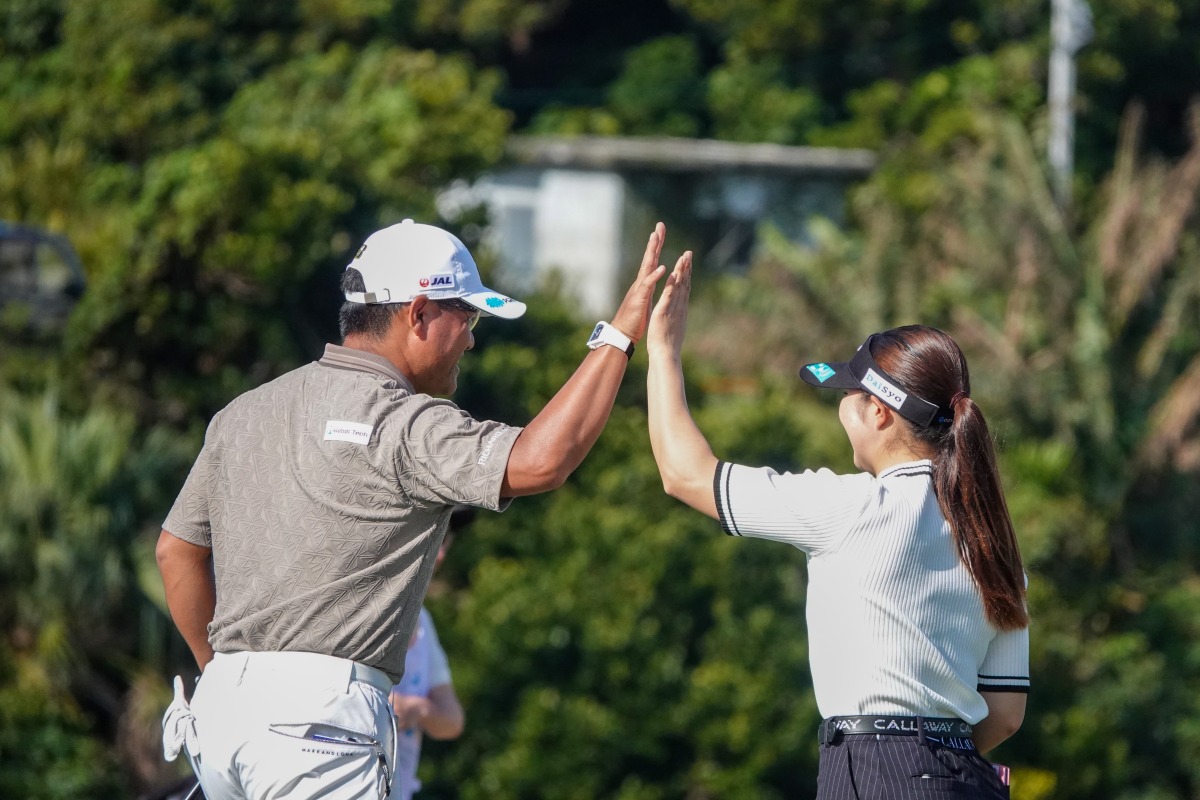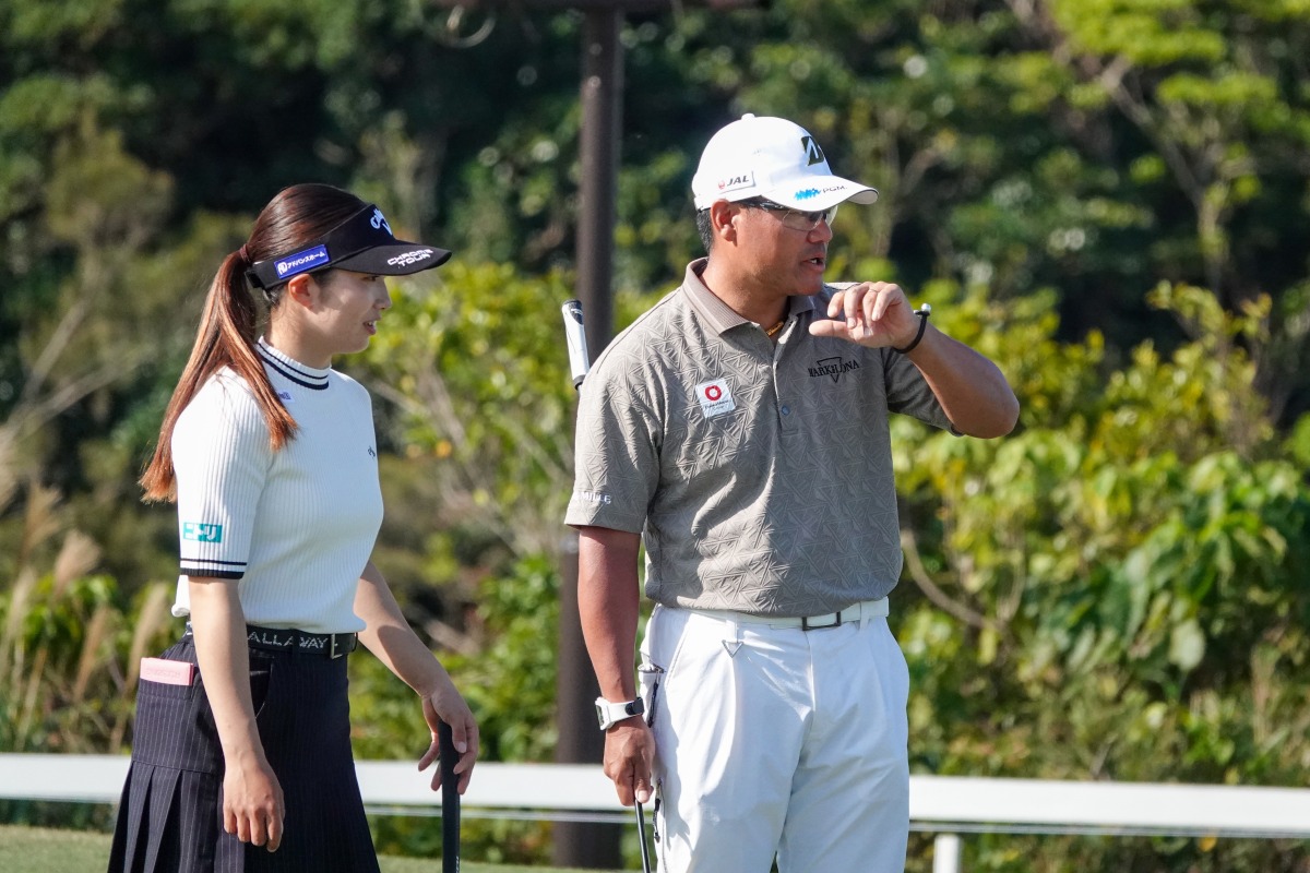 バーディを決めてハイタッチをかわす場面もあったが、思うようにスコアを伸ばせなかった二人。宮里はこのあと、沖縄に残って山田大晟らと合宿を行ったのち、地方トーナメントに出場して試合勘を取り戻しながらツアー開幕戦に向かう予定だ。