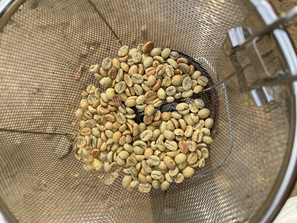 音が鳴る感覚が短くなったら今度は豆ができるだけ重ならないように左右に振りながら焙煎する。よく見るあのアクションです。でも慎重というより単にビビリな私の豆の色がなかなか変化しない……。