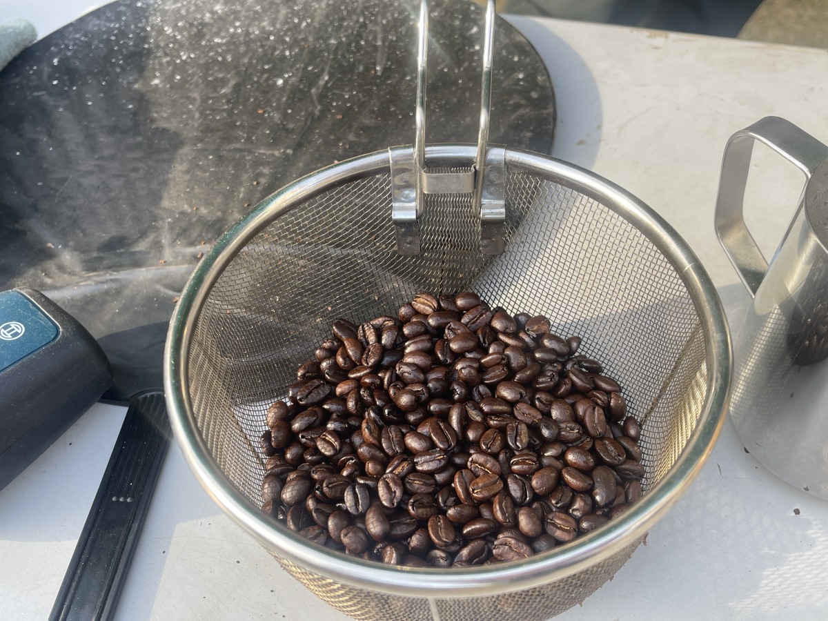 隣で参加していたご夫婦の奥さまの豆はすでにいい色になっている! しかし焦りは禁物。いつもいい感じになってきたところであと少しの我慢ができず失敗しているダメパターンを思い出すんだ……。と言い聞かせてザルを振り続ける。でも私が目指す中深煎りの色にはなかなかならない。どこで焙煎をやめるかを見極めるセンスも必要なのです。