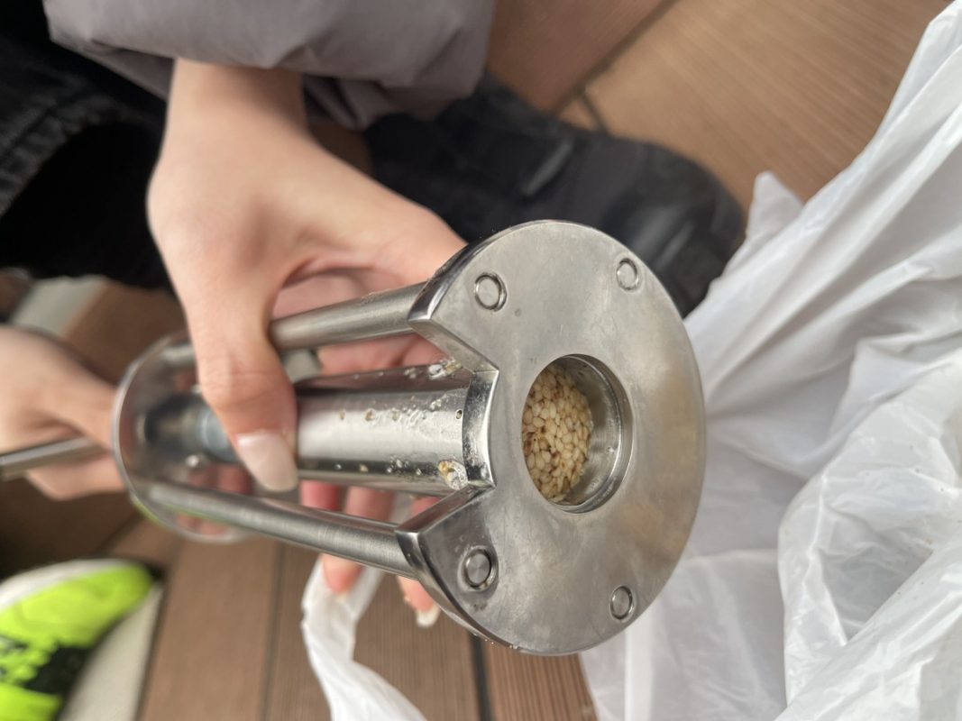 私の隣はお父さんと娘さんの親子。娘さんがゴマを入れてハンドルを回し……、とこれがなかなかスムーズにいかない。お父さんがチャレンジしてみるも、かなりの力がいるようで、倒さないようにバランスをとりながらハンドルを回すも難しく、最終的にはハンドルを回す人と支える人とふたり掛かりに!