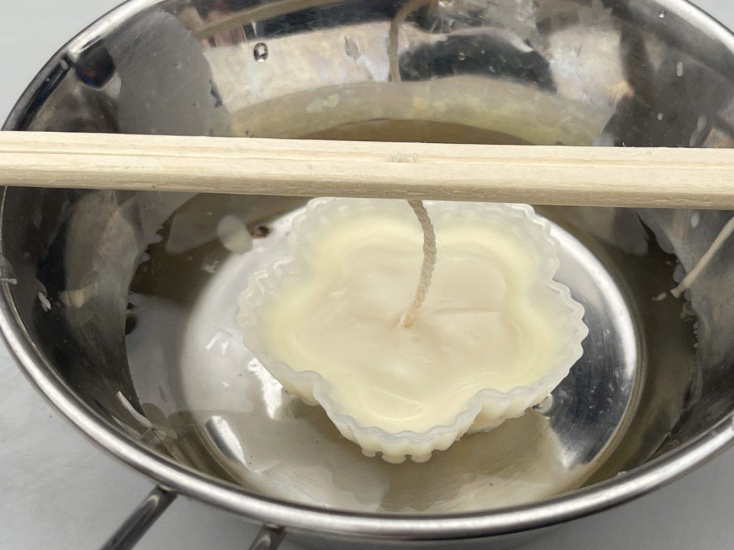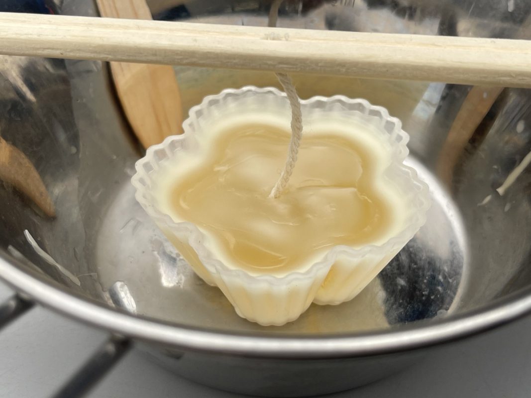 ごま油だけでは固まらないのでミツロウを加えます。逆にミツロウだけだと燃えにくいのだとか。温めて溶かしたミツロウを加えたら固まる前に油が均一になるようにかき混ぜます。この日はとっても寒かったので、みるみるうちに縁が白くなっていきます。急がねば!