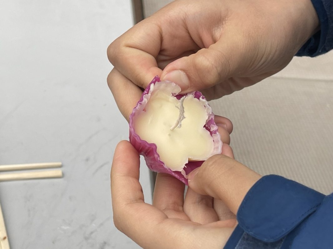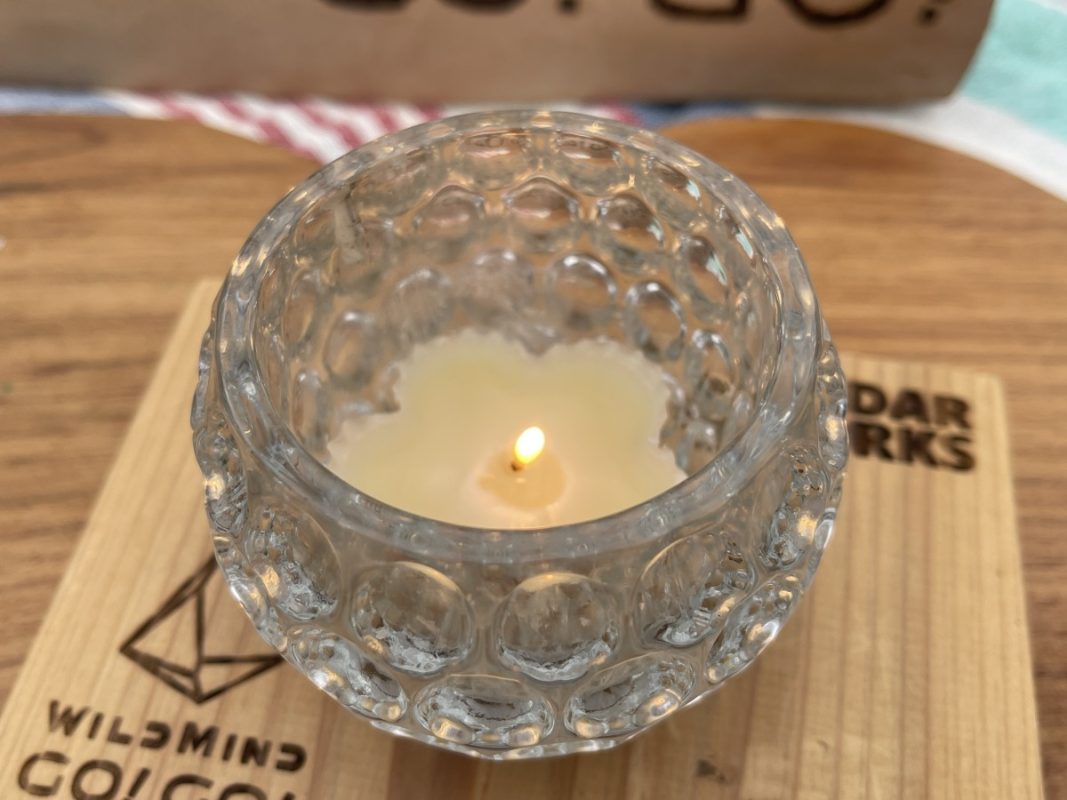 炎の揺らぎに癒されます。自分で作ったキャンドルなのでなおさら。屋外ではわからなかったのですが、家で火入れをしてみるとほんのりゴマの香りが広がりました。