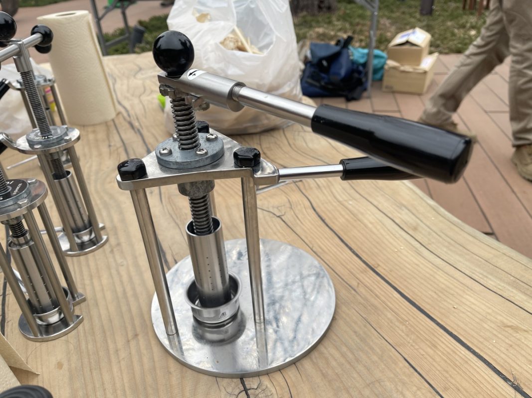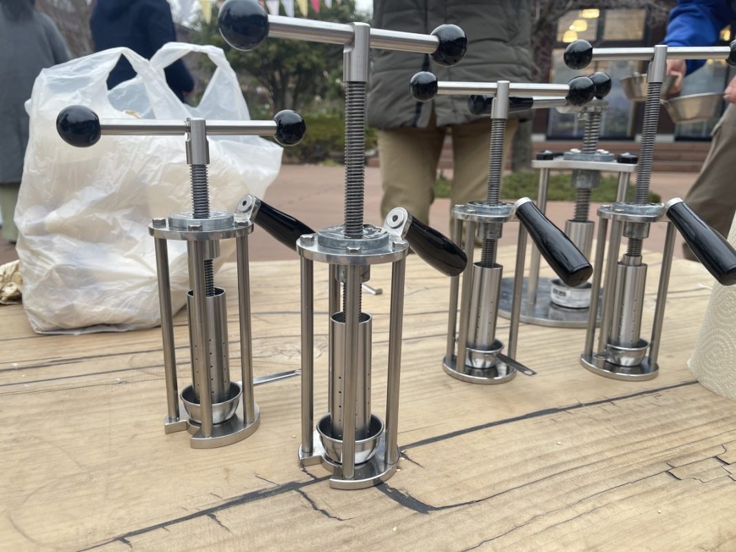 今回の個人的な目玉は圧搾機、その名も「家庭用油しぼり機 SH i BORO-mini」。一見自作で同じような器具を作れそうですが、かなりの圧がかかるため相当難しいとのことでした。船舶用制御盤組み立て業務をしている会社の製品と聞いて納得。搾りたい人は素直に製品を買いましょう。