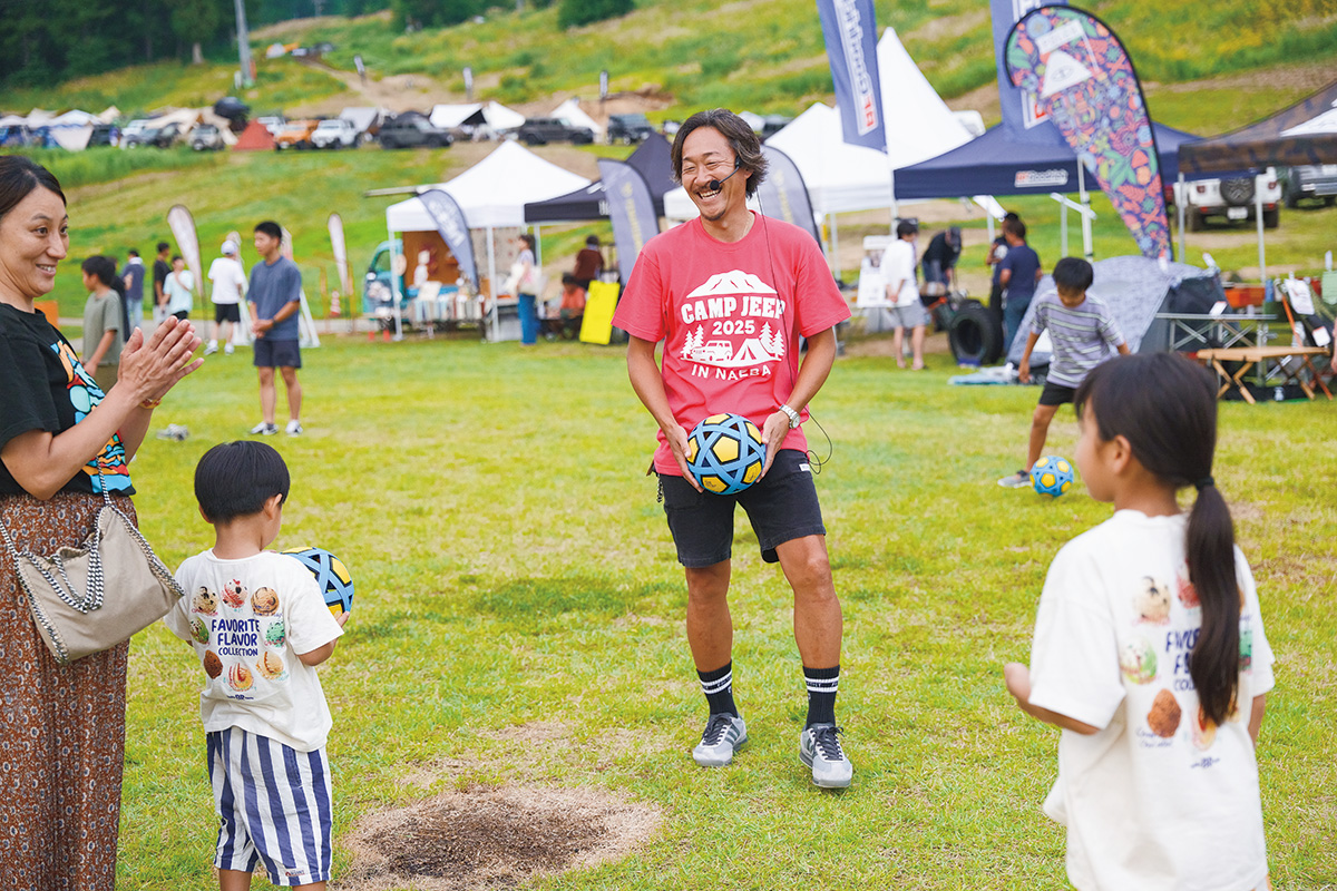 Jeepオーナーだけが参加できる「Jeepラウンジ」。アロマ体験ワークショップやオーナー集合写真、サッカー元日本代表の石川直宏さんによるオリジナルサッカーボールつくりなど、特別プログラムを開催。全国を横断中の「ピンクラングラー」(1枚目の写真)もイベント参加。