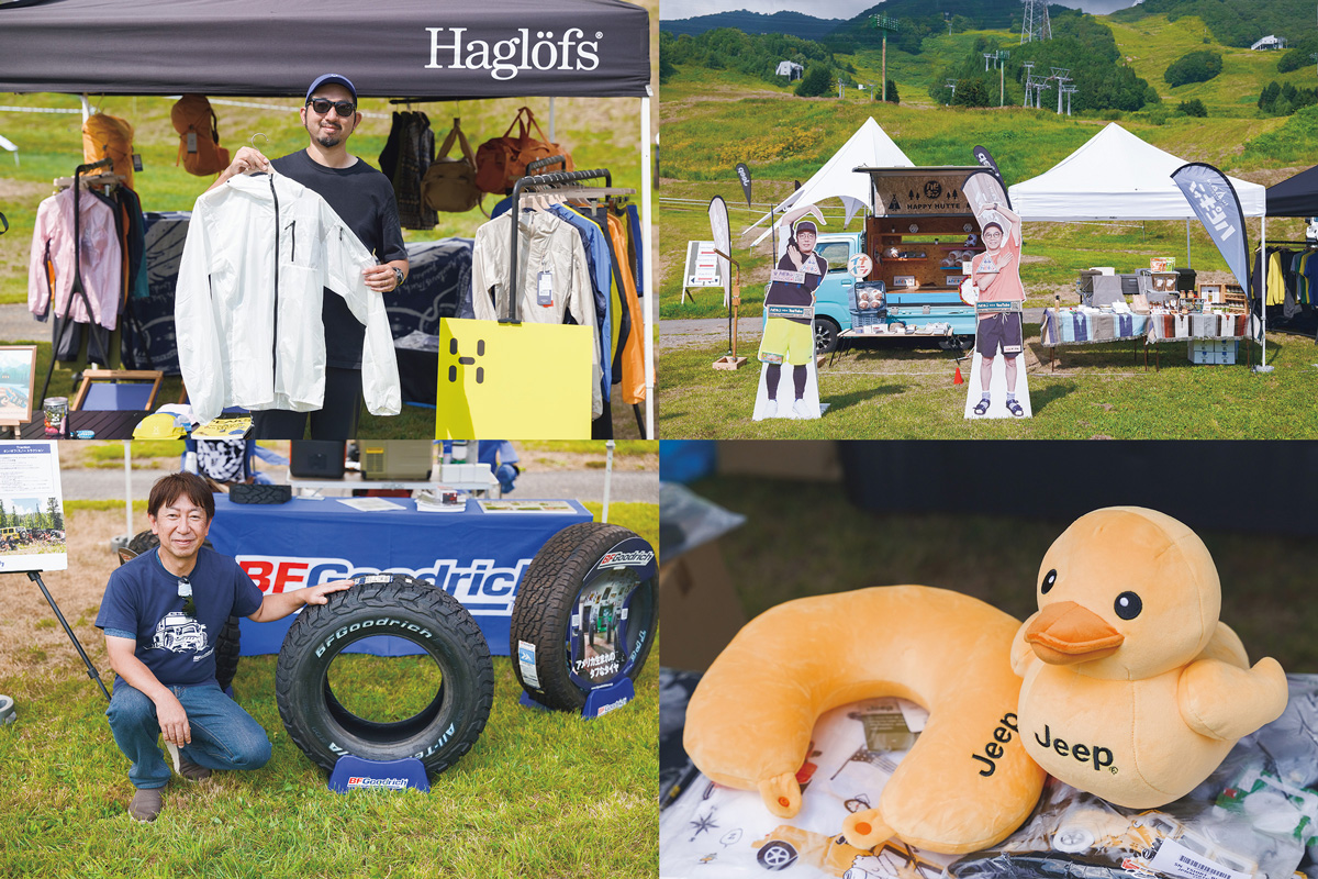 ネックピローになるダックなどJeepオリジナルアイテムの「Jeep オフィシャルストア」をはじめ、タイヤのBFGoodrich、マルチツールのレザーマン、アウトドアブランドのホグロフス、キャンプ・アウトドア情報メディアのハピキャンなど、Jeepに関係の深い各社が出展。