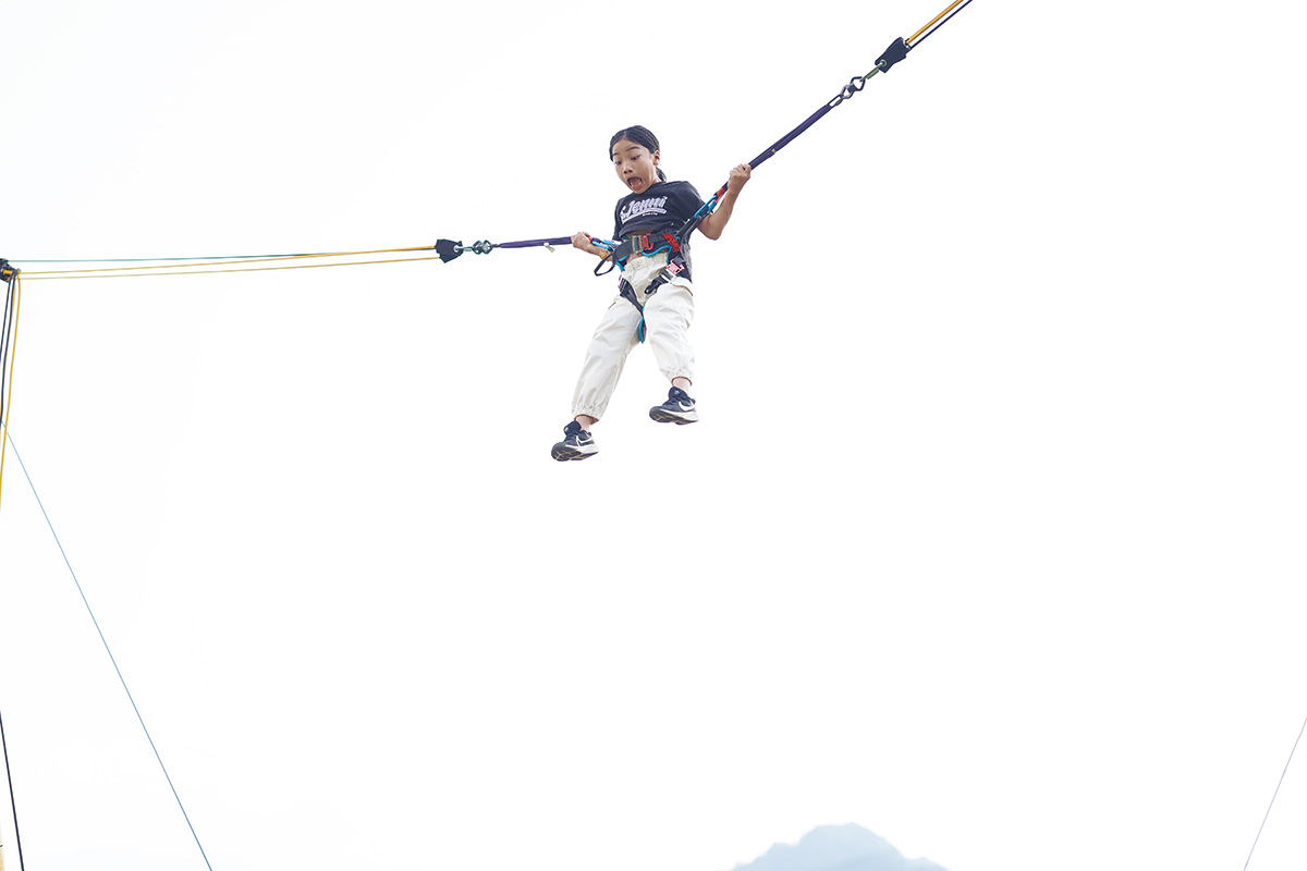 ハーネスを装着し、大ジャンプに挑戦。地面から高く飛び上がるスリルとフワッと浮く感覚がやみつきに。コツがつかめたら空中で一回転も!