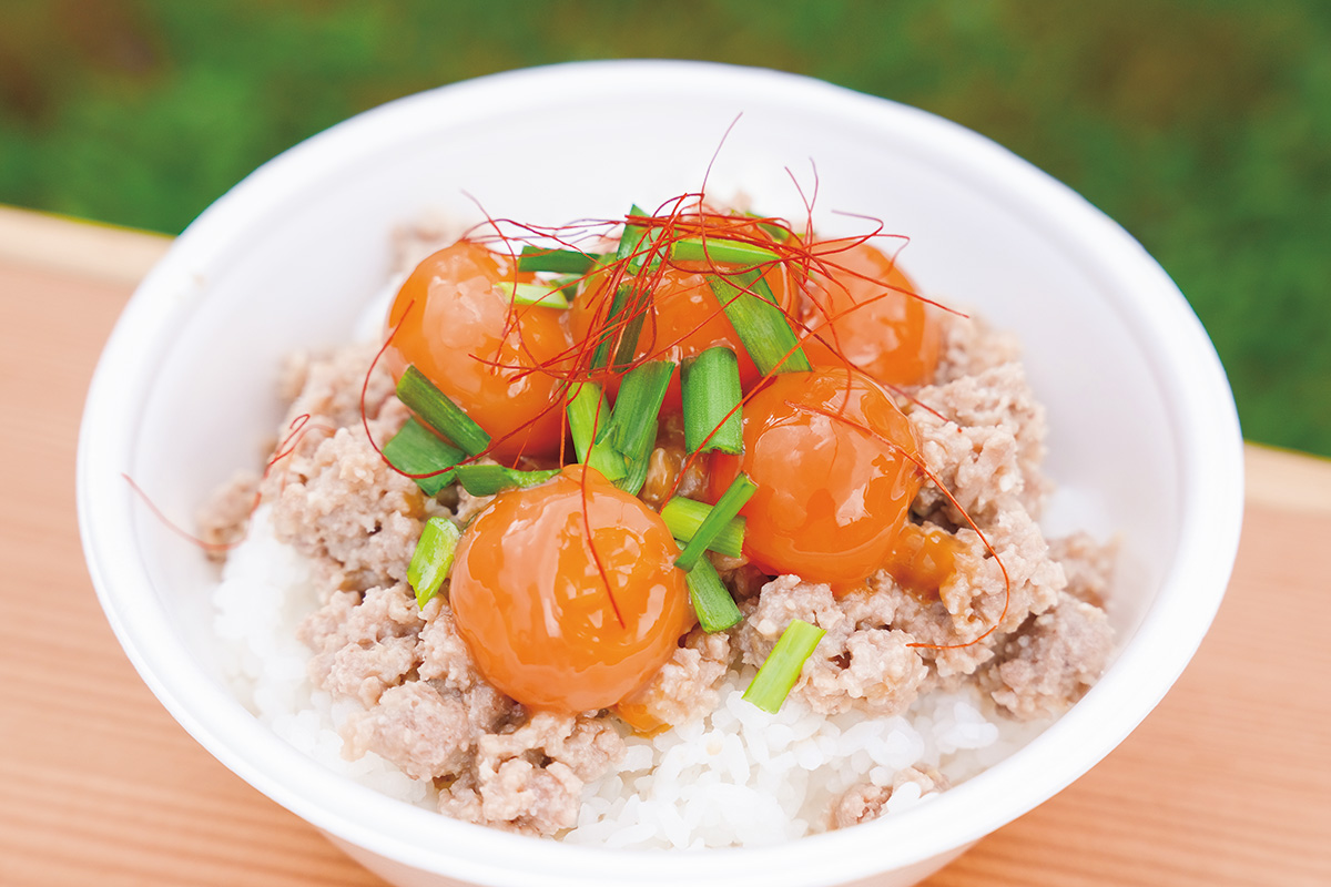 上越の卵を上越の醤油に黄身漬けし、上越の米にのせた「上越特産肉みそタマゴール丼」。