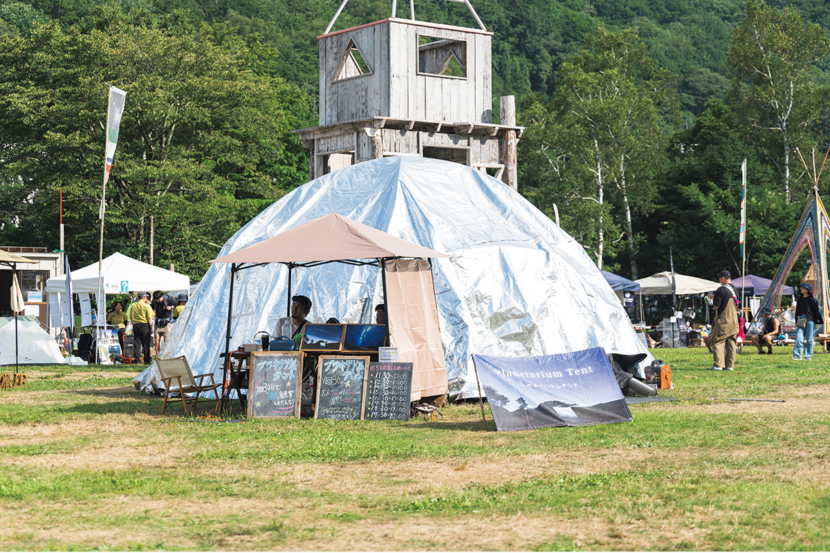 満天の星を観賞できるプラネタリウムテントが登場! 星のソムリエ・猪俣慎吾さん解説のもと、仰向けになって星空観賞。
