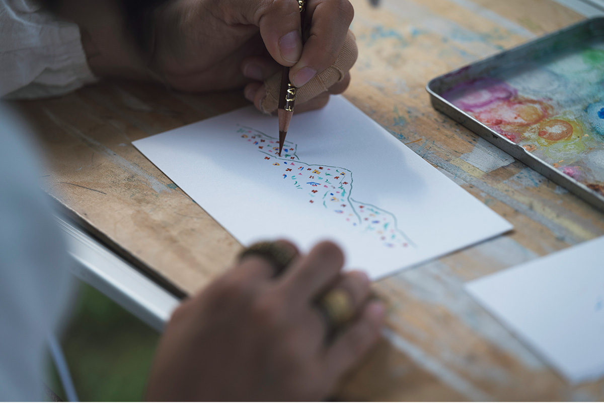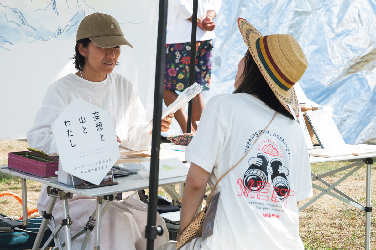 絵描きの伊藤佳美さんによる本・アイテムの物販のほか、山の絵をその場で描き上げるオーダーメイドのイラストワークも。