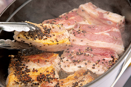 1. 鍋に油をひいて豚肉を並べ、しっかりキツネ色になるまで全面焼く。