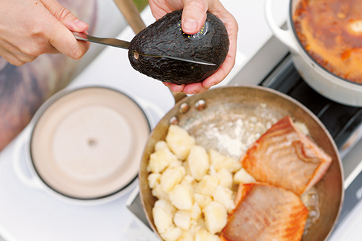 3. ジャガイモに焼き色がついたらバターをのせ、塩・コショウで味を整える。お好みで同時にとなりのコンロでアボカドを焼く。