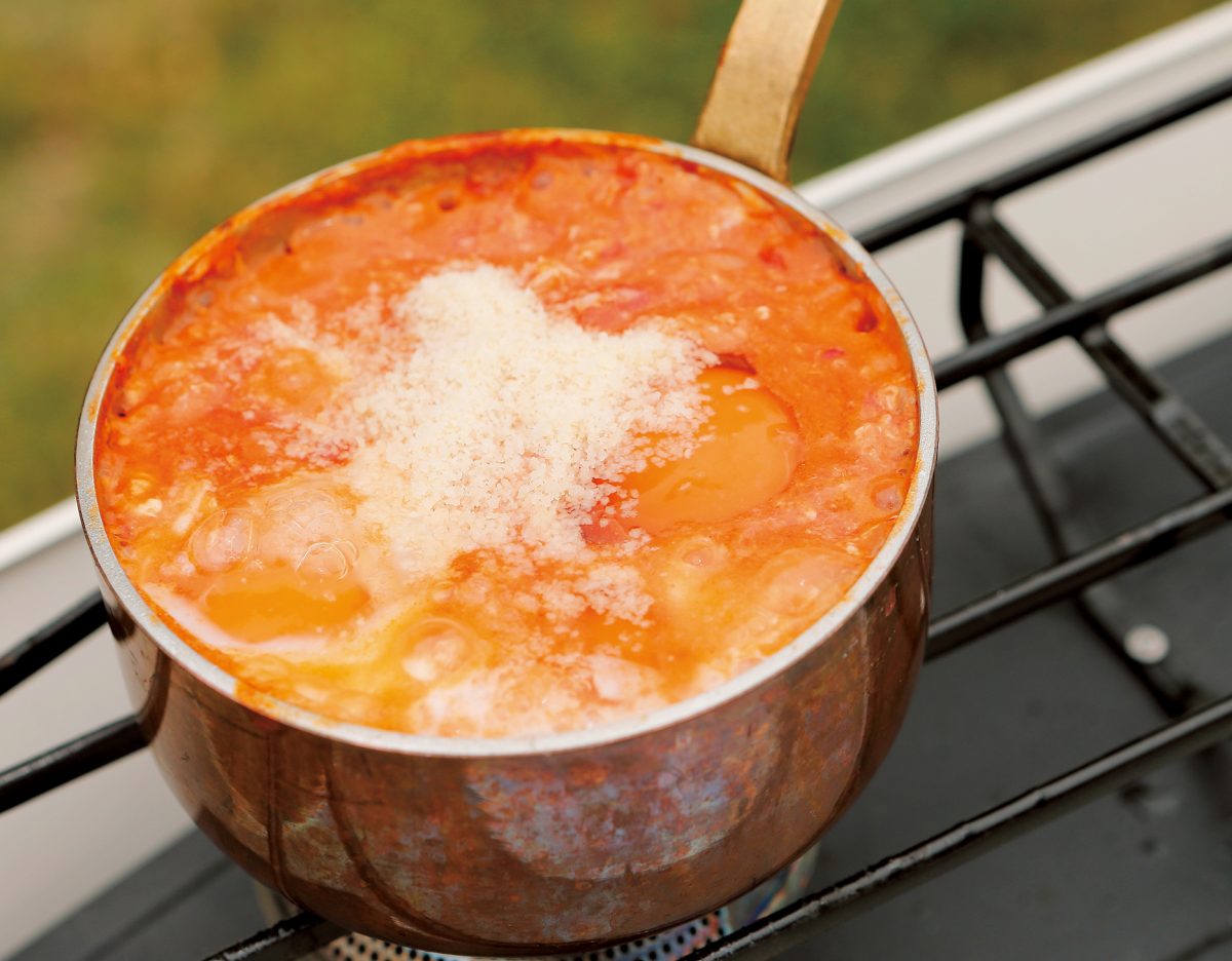 2. 1.に卵を落とし、好みのかたさになるまで火をとおす。粉チーズを好みの量かける。
