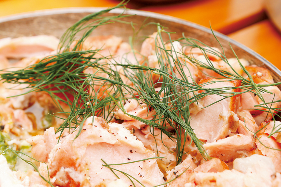 みんなが大好きなサーモンを豪快に焼いたあとは、子ども用にはベシャメルソースのトッピング、大人用にはディルをたっぷり乗せてあげましょう。