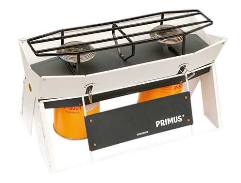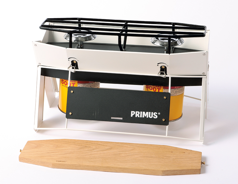 伝説的ツーバーナー「プリムス2222」を彷彿とさせるフォルム。収納時はフタの役割、使用時は鍋敷きになるウッドボードがアクセント。3,500kcal/hの高火力もポイントです。