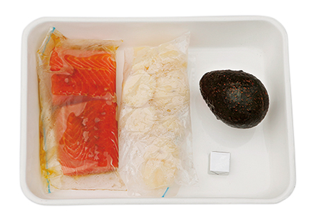 2. ジャガイモは保存袋ごしに粗く潰しておく。フライパンを中火で熱し、(A)のサーモンを焼く。片面に焼き目がついたらひっくり返し、その横でジャガイモを焼く。