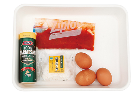1. 小鍋にトマトソースと水1/2カップを入れ中火にかけ、煮たったらおにぎりを入れ、弱火にしてスプーンで混ぜる。