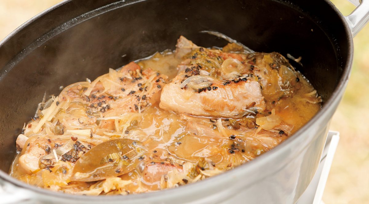 キャンプではほったらかしでOKの煮込み調理もおすすめ。普段使っているルクルーゼやストゥブ、バーミキュラなどが活躍します。