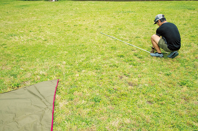 メインポールのペグダウンの位置は、まず幕の長辺部分にまっすぐポールを置き、その下端から90度ポールを横に置いた先。大人の足で三歩の距離が目安です。