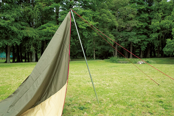 使用人数や天候によっては、サイドの角二か所をサブポールで立ち上げます。有効面積が増える利点に加え、横から出入りしやすくなり、開放感もUP!