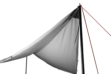 「張りやすさ」を目標に作られた手裏剣型タープ。21カ所もあるトグルと前後2辺のテンションスリーブを活用することで、じつに30パターン以上もの張り方が可能になります。シリコンコーティングされたナイロン製シートは強度も充分。メッシュテントの「ニンジャネスト」をインナーにして、軽量テント泊を楽しむのもいいですね。ポールは別売りです。