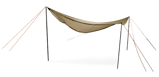 中央のメインポールと4本のコーナーポールで立ち上げる、ユニークな形のレクタタープ。サイドの開口と頂点部分のベンチレーター、難燃性が高いコットン混紡生地のシートによって、幕下でも火器を扱えるのが魅力です。雨の日に焚き火を楽しんだり、薪ストーブを囲んで団らんしたりと、キャンプの幅を広げてくれますよ。ポールは別売りです。