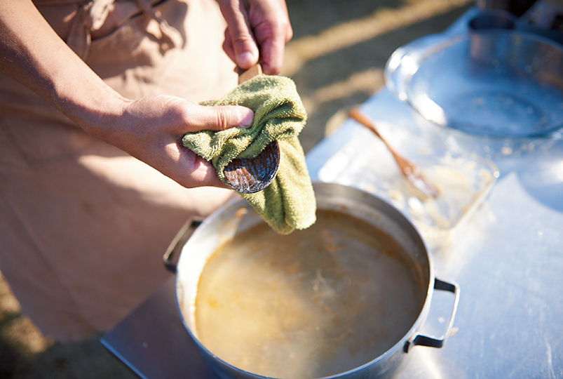 後片づけの素早さこそ、達人の腕の見せどころ。小雀さんのキッチンでは常時ケトルが炭火やツーバーナーにかかりお湯が沸いた状態で、炊事場が水しか出ない状況でもサッと油汚れを落とすことができます。あると便利なシリコンスクレーパーやクロスなど、忘れがちな「食後」の準備も怠らずに。