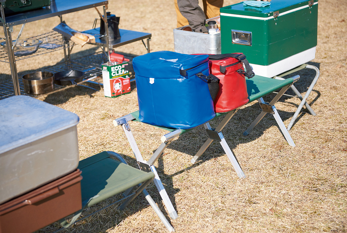 道具を直接地面に置かない、ものや食材の出し入れでいちいち腰を屈めない……などの理由から、小雀さんは用途の多い折り畳み式のベンチを常時車に積んでいます。キャンプの人数が増えたときは本来のベンチとしての使い方もでき、夜は焚き火まわりでも重宝します。