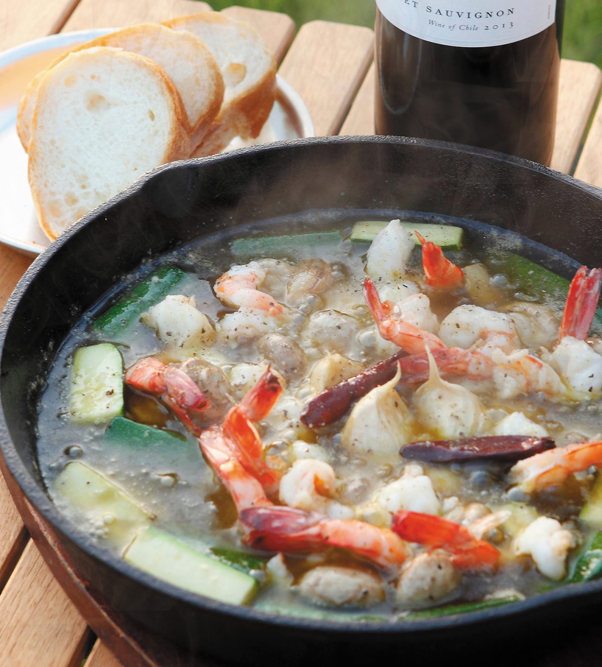 ニンニクの旨みが溶け出した熱々のオリーブオイルでシーフードを煮込む定番スペイン料理。鋳鉄製のスキレットを用いて保温時間を長めに確保するのがポイント。夜は身体を温め、オイルの脂質には代謝を高める効果も!バゲットを添えてどうぞ。