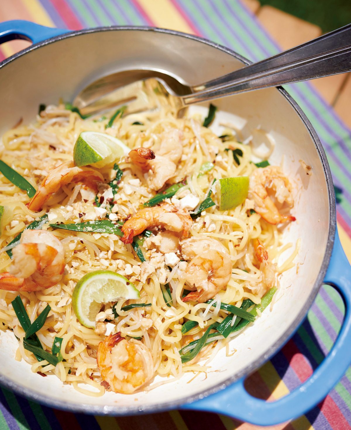 ワンポットでできるアジア風焼きそば。麺はタイ食材のパッタイを焼きそばの麺で代用して手軽に。全食材をダッチオーブンに放り込み、中火でゆっくり蒸し焼きにするだけで、夏のキャンプにピッタリなアジアの味が完成!
