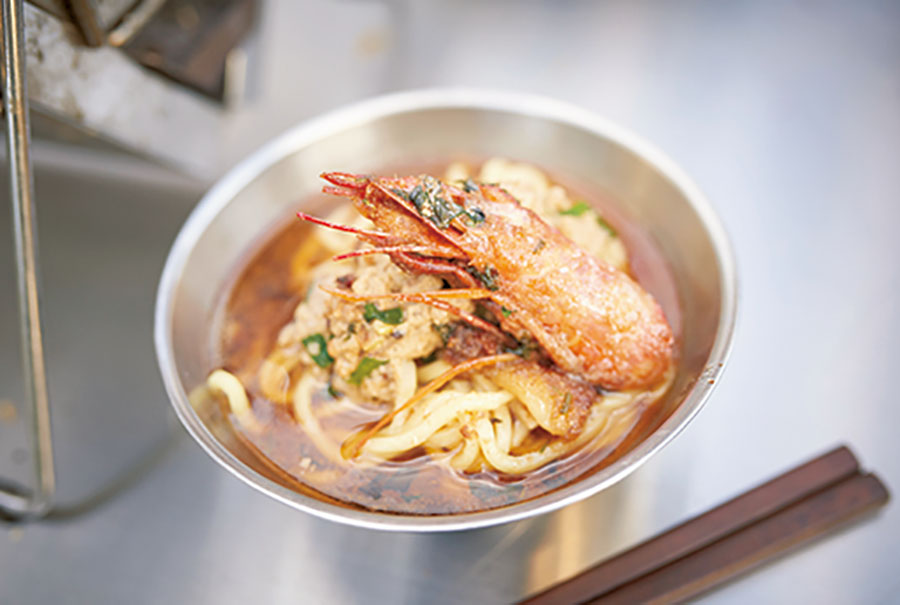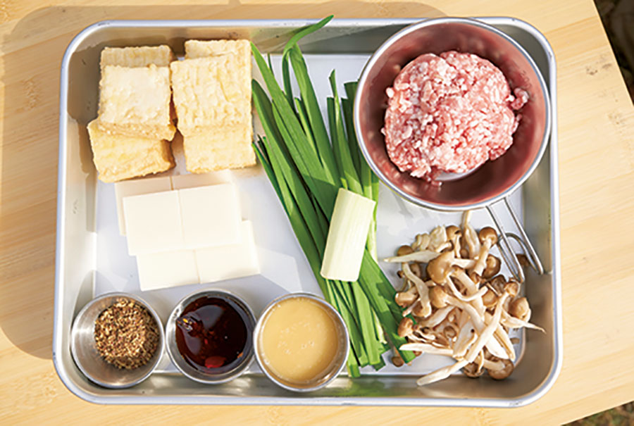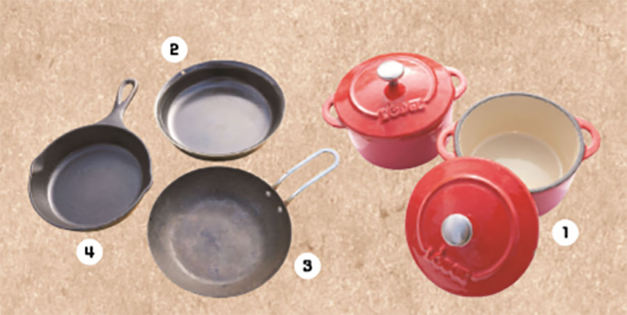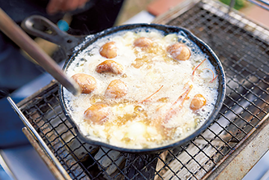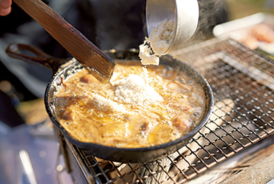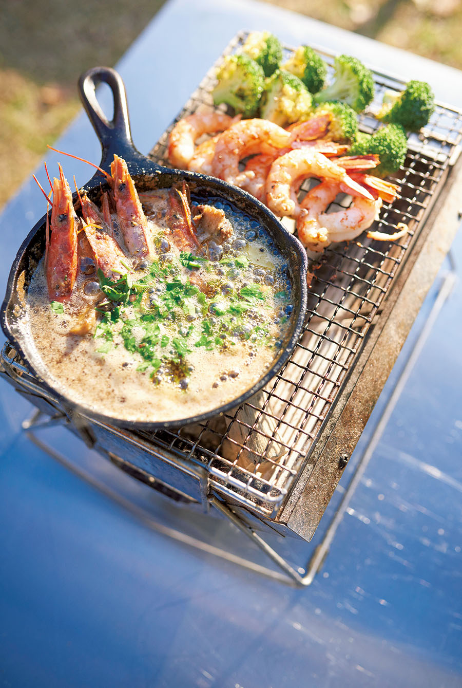 グリル料理で簡単にメニューのバリエーションを増やせる道具が小型フライパンや耐熱容器。今回も麻辣ソース、エビのバターソース、カマンベールチーズディップに登場。小雀さん愛用はロッジ/エナメルミニココット、スキレット8インチ(写真①④)、SOTO/GORAフライパン22cm(②)、ユニフレーム/ちびパン(③)