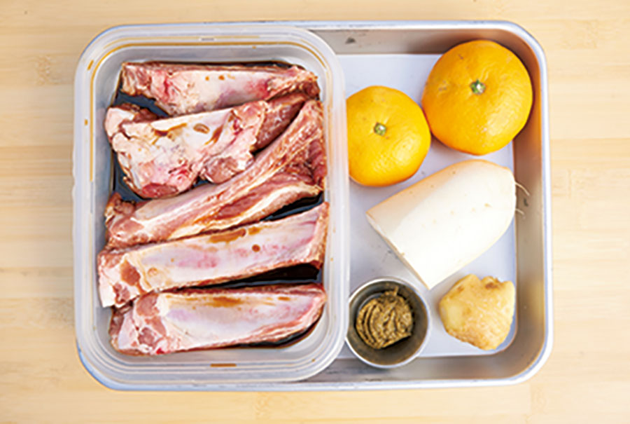 - 前夜に白だし、お酒、しょうゆを加えた食品コンテナなどへスペアリブを浸し、ひと晩漬け込む。