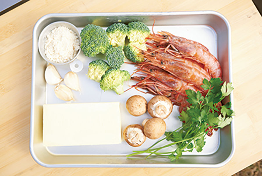1 エビの頭を取って、尻尾の皮を剥き、塩を振る。ブロッコリーは小分けに切り分け、マッシュルームは4等分に切る。ニンニクは皮を剥いて芽を取り、潰す。