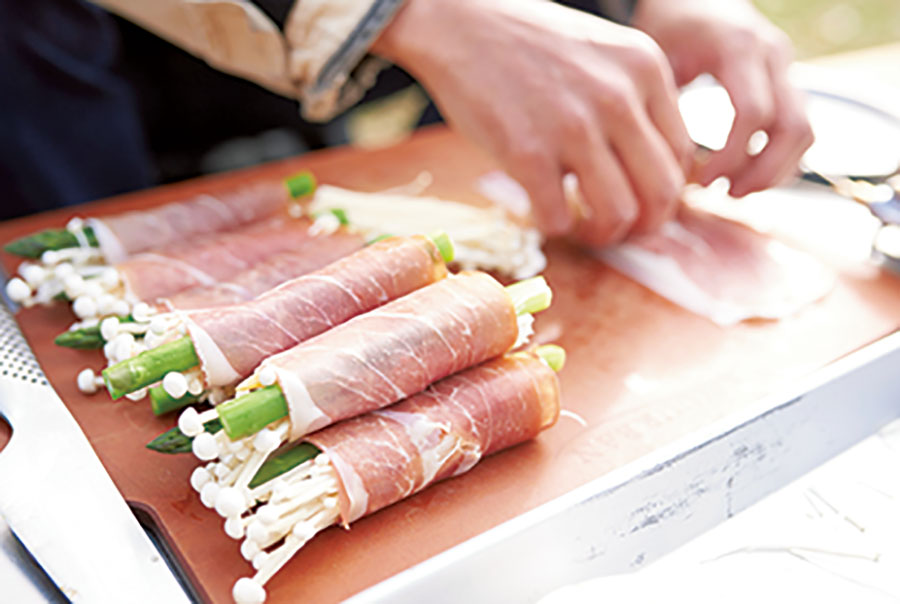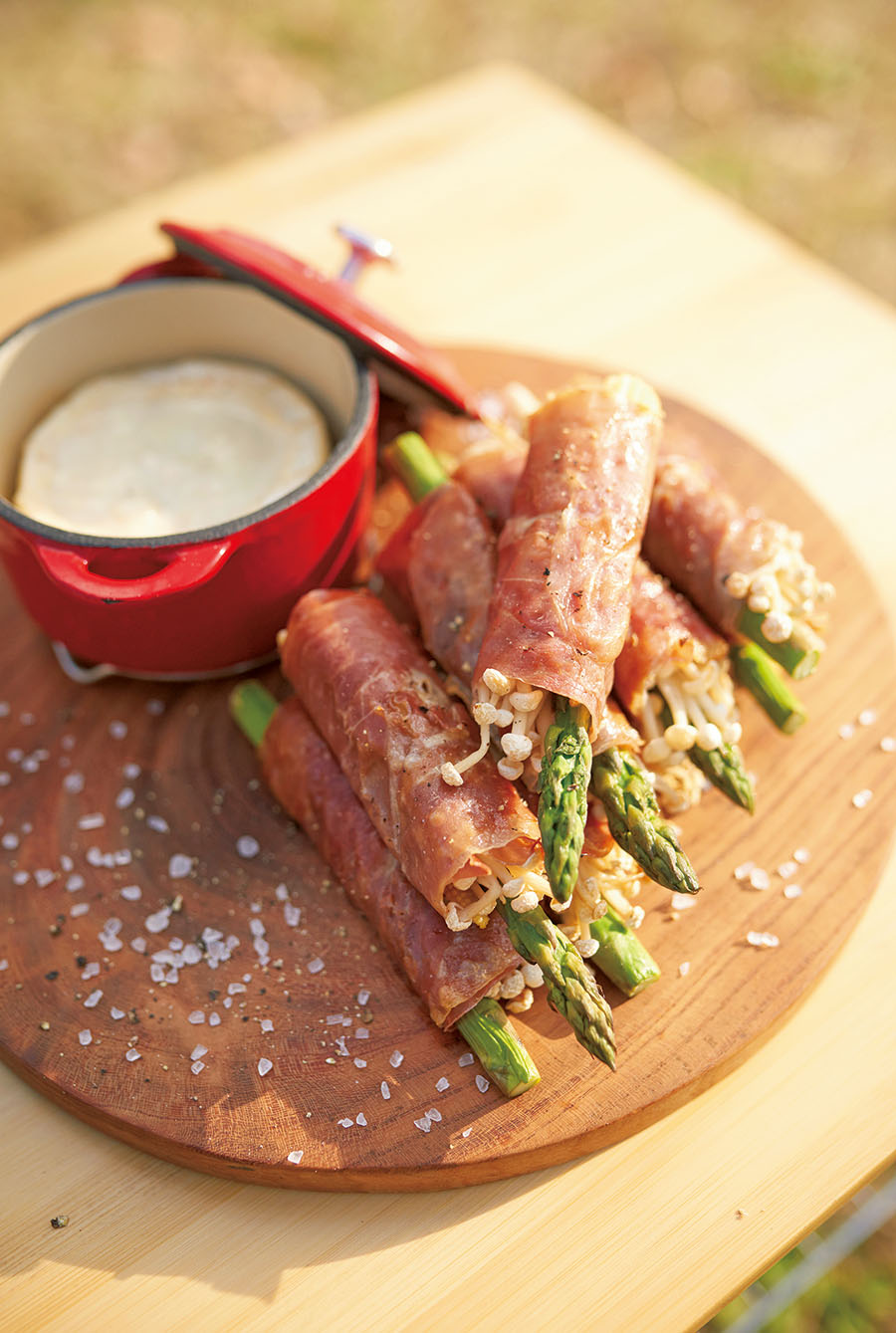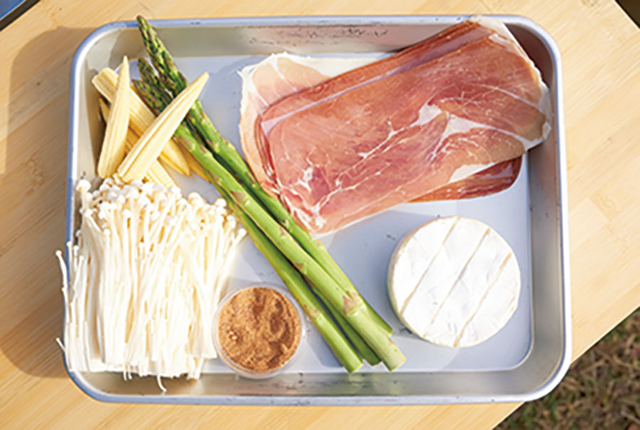 - 巻いた野菜を炭火でほどよく焼く。カマンベールチーズにナツメグを振りかけ、焼けた生ハム巻きをチーズに付けて食す。