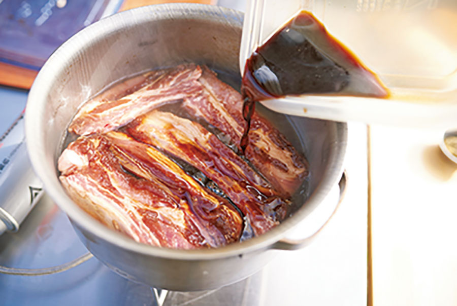 - 鍋に水300㎖、スペアリブを漬けていたタレを入れ、シングルバーナーなどで強火で沸騰させる。スペアリブを加え、再沸騰したら 中火にし5〜10分煮込む。