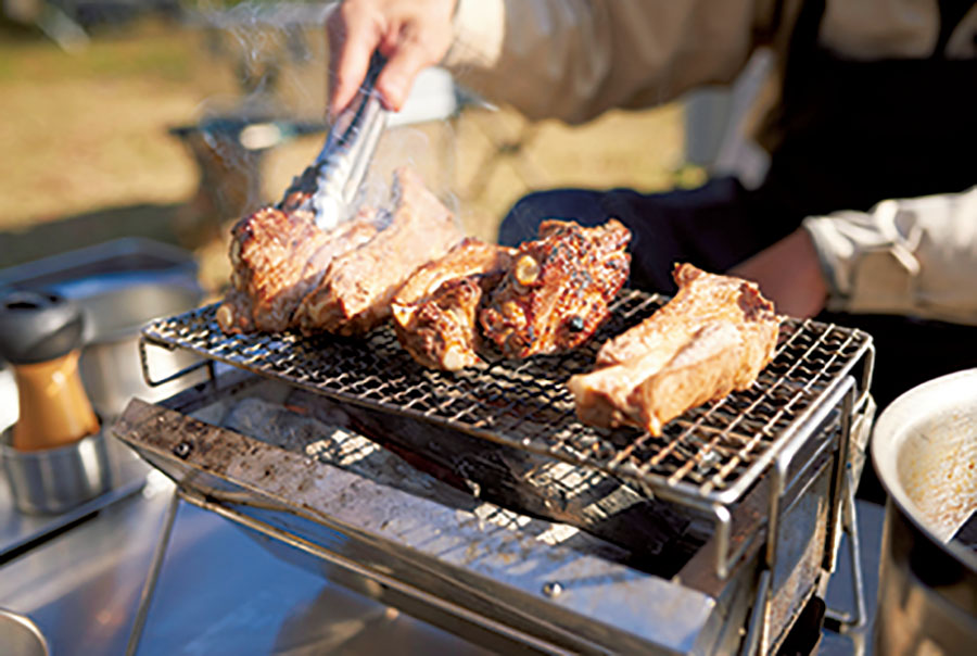 ローテーブルにセットした卓上グリルを囲んで、さぁスタンバイ。手の届くところに全食材を置いて、炭火でひたすら焼いて食べる。そんな簡単シンプルでおいしいキャンプをすごしてみませんか。