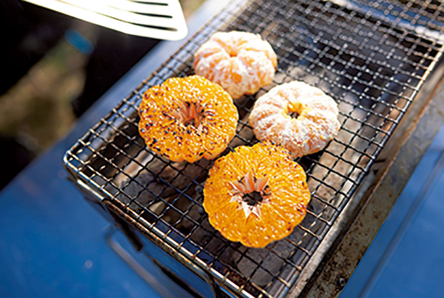 - ミカンの皮を剥いて半分に切り、炭火で両面焼き、お皿に盛る。