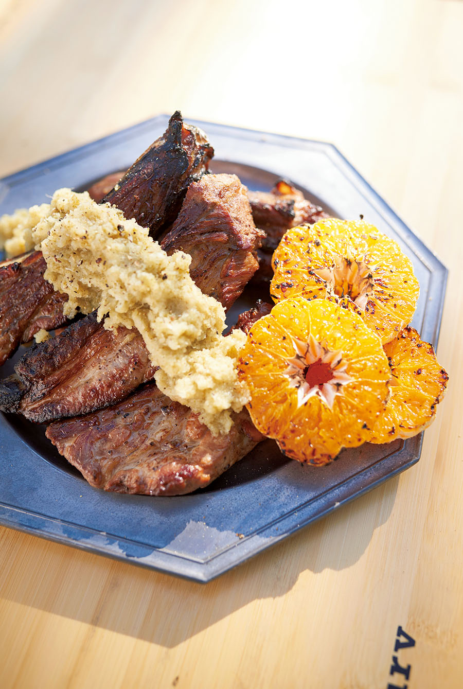 - 煮たスペアリブを炭火でほどよく全面焼き、お皿に盛り付け、ソースをかける。ミカンを添えたら完成。