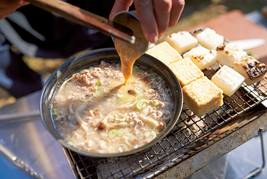 炭火の火力を強めたエリアでソースを作る。厚揚げとお餅は中~弱火のエリアでじっくり焼いていく。
