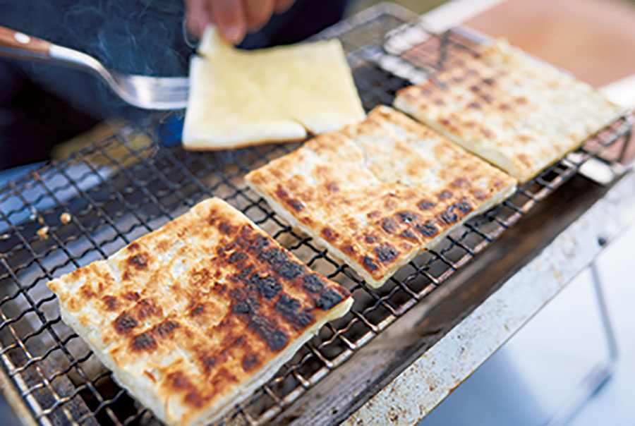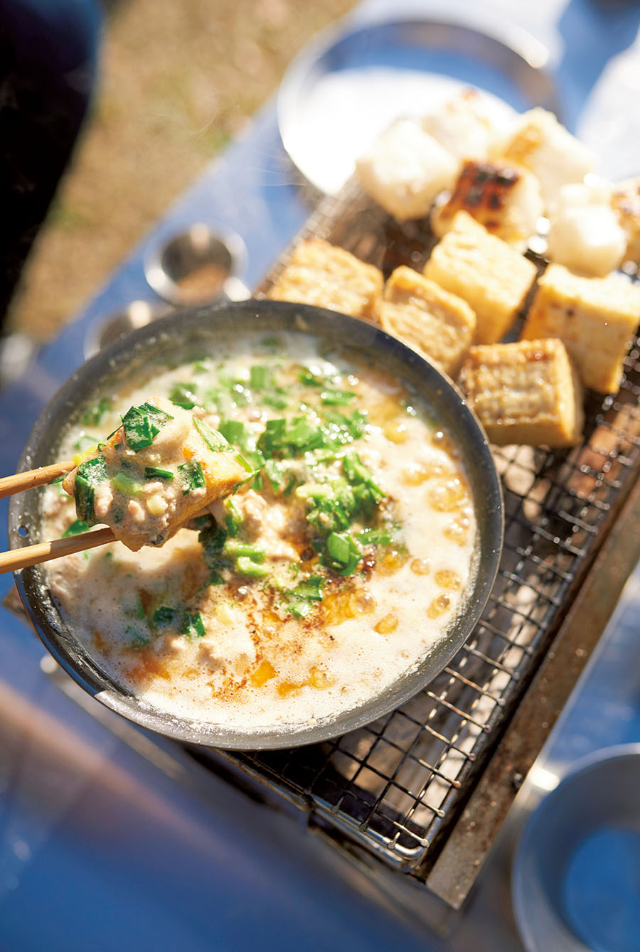 - お餅と厚揚げを炭火でほどよく焼き、2のソースに刻んだニラ、ラー油を加え、仕上げに花椒をかける。